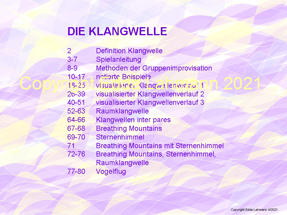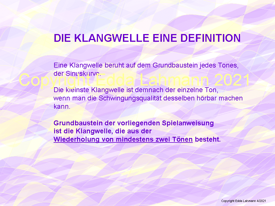 Die Klangwelle beruht auf dem einfachen Prinzip der physikalischen Schwingung des Einzeltones, der Sinuskurve, die vergrößert durch die Wiederholung mindestens zweier Töne (auch Klänge) als Klangwelle hörbar wird. Und für besonders Geübte auch im Einzelton hör- und spielbar ist. Die Klangwelle wird hier als Übung und Strukturgrundlage für unterschiedliche Improvisationsspiele vorgestellt. Farbe und Klang sind beides Schwingungen, die sich physikalisch allein durch ihre Frequenzen unterschieden. Demnach wird die Klangwelle durch farbige Visualisierungen veranschaulicht und erleichtert durch die bildliche Umsetzung die musikalische Vorstellung für die Verklanglichung unterschiedlicher Naturphänomene. Hauptanliegen dieser Bilddatei ist die Interaktion von Klangvorstellung und grafischer Visualisierung, da sie beide die Potenz sensorischer Erfahrbarkeit haben und durch die Visualisierung den Klang im Verlauf und im Zusammenspiel wie Farben und Linien geschmeidiger zusammenführen oder kontrastreicher gegeneinander absetzen lassen.